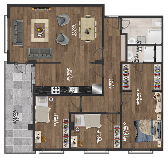 250 m² 4+1 seçenekleriyle farklı yaşam tarzlarına hitap etmektedir.